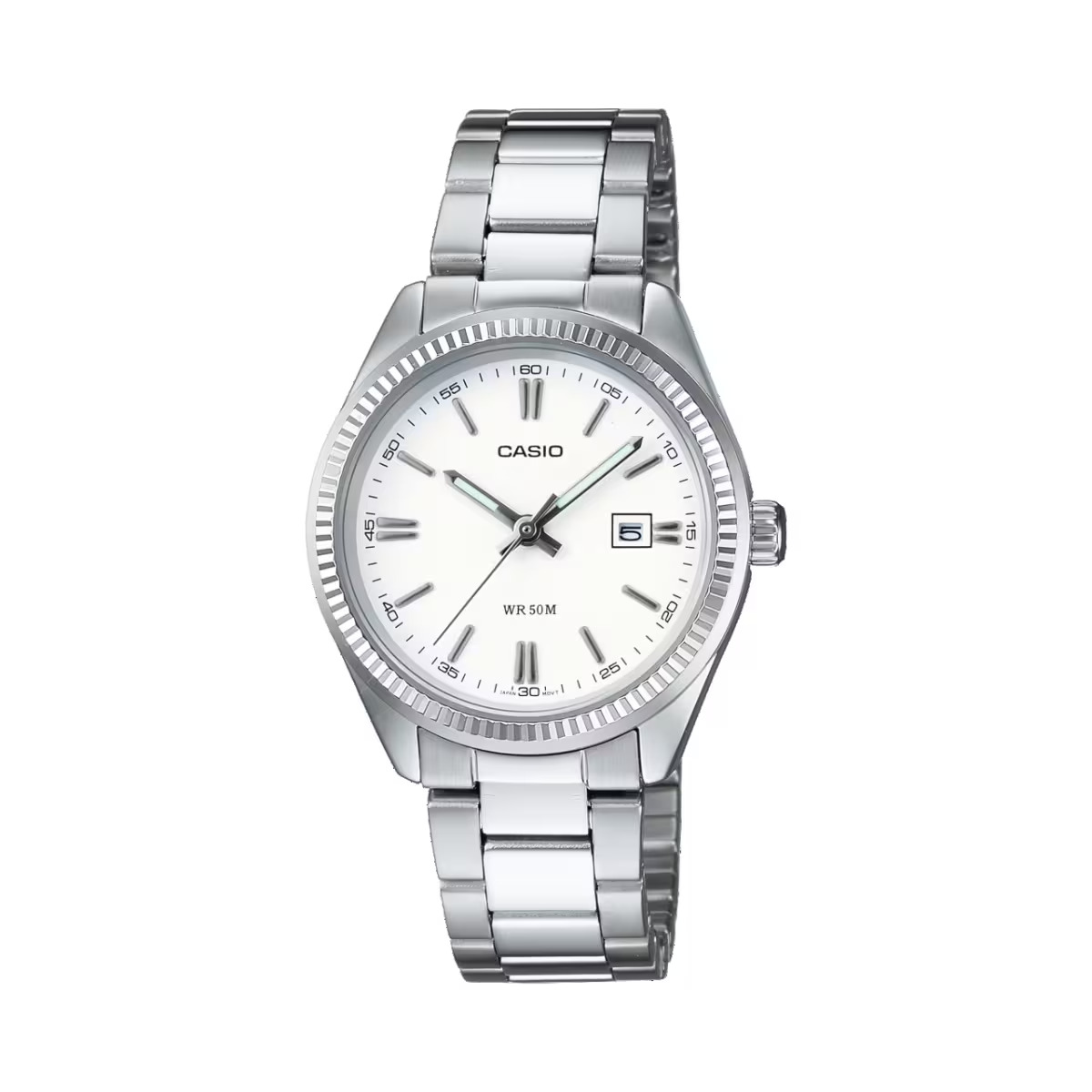 Il CASIO LTP-1302PD-7A1VEG presenta una cassa e un cinturino realizzati in acciaio inossidabile di alta qualità, che garantisce durabilità e resistenza nel tempo. Il vetro minerale protegge il quadrante da graffi e danni accidentali.